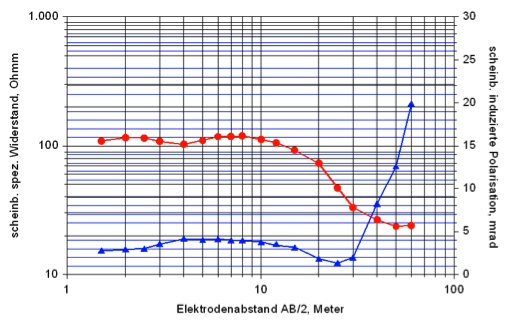 Komplexe Widerstandsmessung (Schlumberger-Anordnung) mit Sondierungskurven für Widerstand (rot) und IP (blau). IP ist hier die Phasenverschiebung (in mrad, Bogenmaß) zwischen Spannung und Strom in der Vierpunkt-Anordnung. Wie bei der reinen Widerstandsmessung gilt auch bei der IP-Sondierungskurve, dass im Gelände eine scheinbare IP gemessen wird.